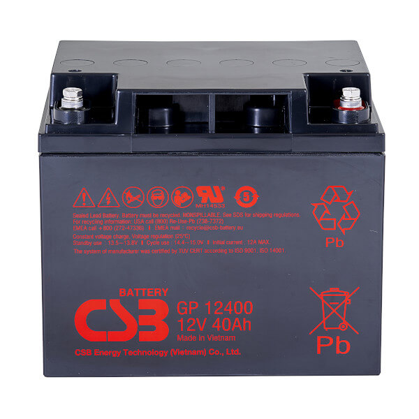 Ventil regulierter Blei-Säure-Akkumulator mit fortschrittlicher AGM (Absorbent Glass Mat)-Technologie CSB GP12400, mit 12 V Spannung und 40 Ah Kapazität.