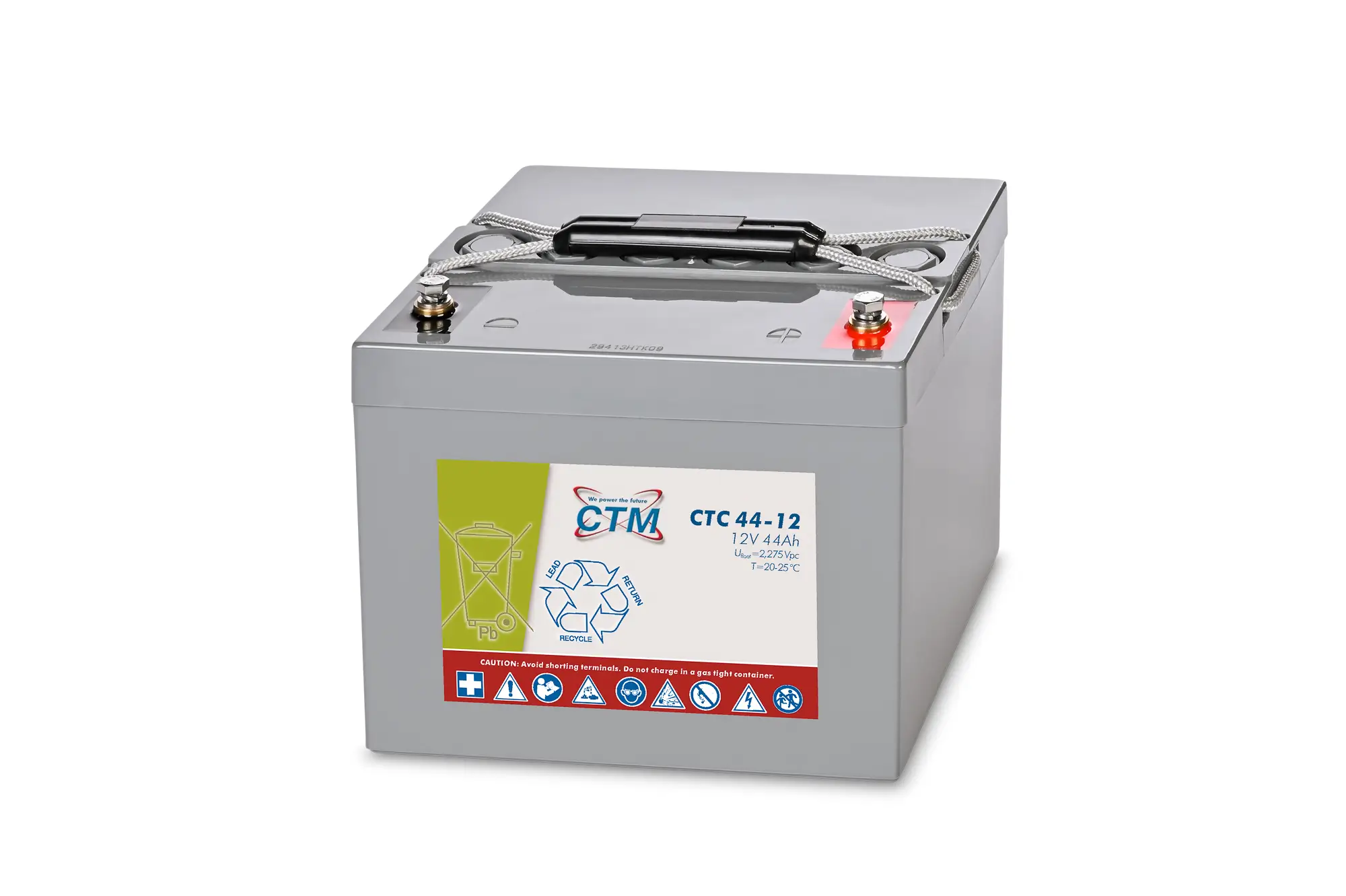 Der CTM CTC44-12 Blei-Gel-Akku bietet eine hohe Zyklenfestigkeit sowie optimierte Beständigkeit gegen Tiefentladung. Typische Einsatzbereiche sind Kehrmaschinen, Arbeitsbühnen, elektrische Rollstühle und Gabelstapler.