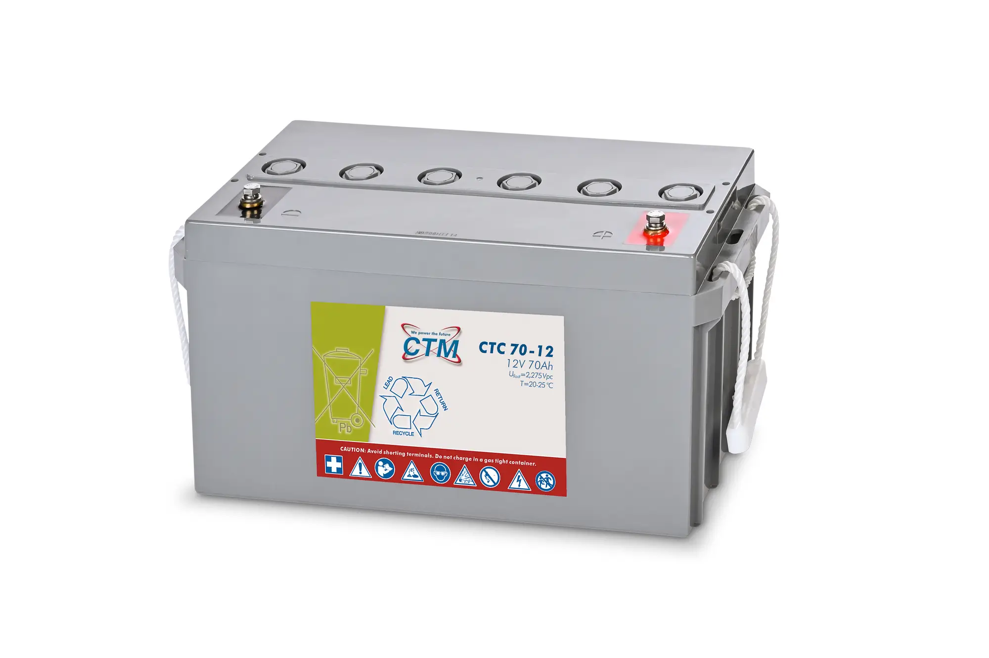 Der CTM CTC70-12 Blei-Gel-Akku bietet eine hohe Zyklenfestigkeit sowie optimierte Beständigkeit gegen Tiefentladung. Typische Einsatzbereiche sind Kehrmaschinen, Arbeitsbühnen, elektrische Rollstühle und Gabelstapler.