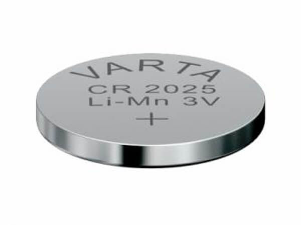 Varta CR 2025 Lithium-Mangandioxid Knopfzelle mit 3,0V Nennspannung für Anwendungen in einem Temperaturbereich von -20C-° bis +65C-°.